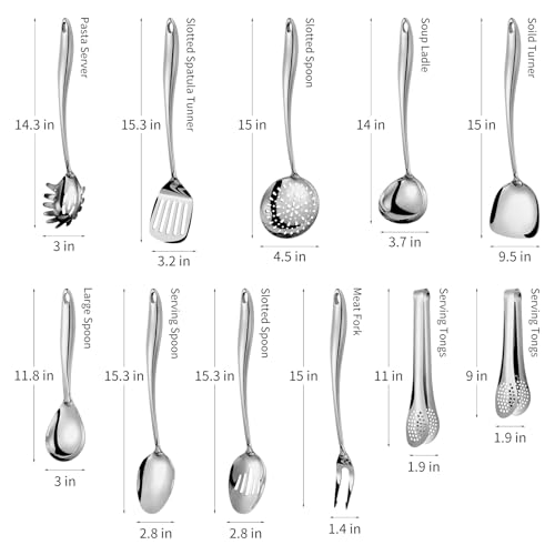 Specification: 304 Stainlss Steel Kitchen Utensils Set, 11 Pcs Long Metal Cooking Utensil Gadgets Tools Set with Spatula, Spoon, Ladle, Skimmer, Turner, Pasta Server, Tongs(Mirror Polished, Dishwasher Safe)