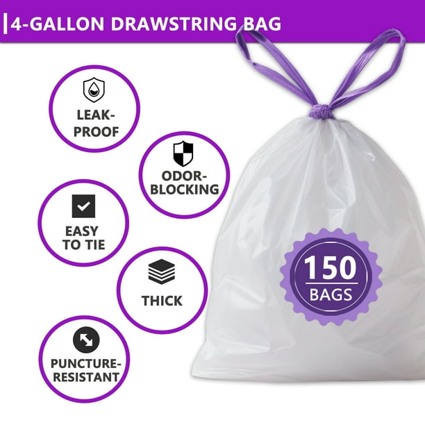 The 4-gallon garbage bag set includes 150 bags, measuring 18 in x19 in, and fits 3-gallon, 3.5-gallon, and 4-gallon trash cans seamlessly. Ideal for small spaces like bathrooms, under-sink areas, or offices, these bags combine compact sizing with reliable performance.