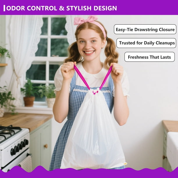 - Ultra-Secure Drawstring Closure: Industrial-grade drawstring cord cinches tightly for a knotless, spill-proof seal. Effortlessly lift full bags without accidental drops—perfect for quick cleanups.