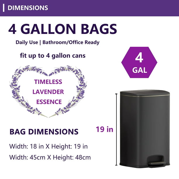 - Lavender-Scented Freshness: Infused with a long-lasting lavender fragrance, these 4-gallon trash bags neutralize unpleasant odors, keeping your bathroom, kitchen, or office smelling clean and fresh.