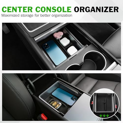 Specification: Abystar 7PCS Center Console Organizer for Tesla Model Y Juniper 2026, Includes Upper & Lower Center Console Trays, Armrest Hidden Storage Box, Wireless Charging Mat, Cup Holder Insert