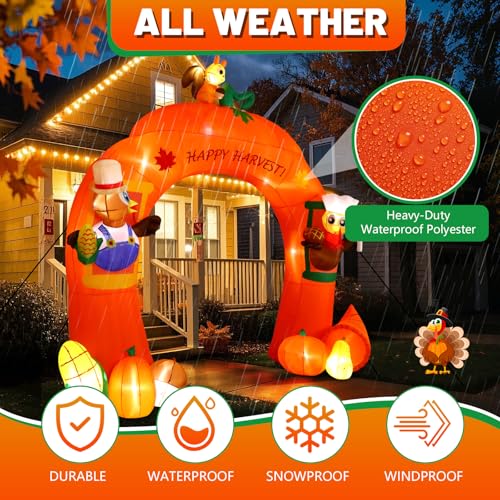 - 【 】Featuring 11 foot tall inflatable Thanksgiving turkey archway, decorated with Turkey, Squirrel and Harvest Fruits—lit from inside. Nothing screams ‘Happy Harvest’ go through the giant inflatable archway.