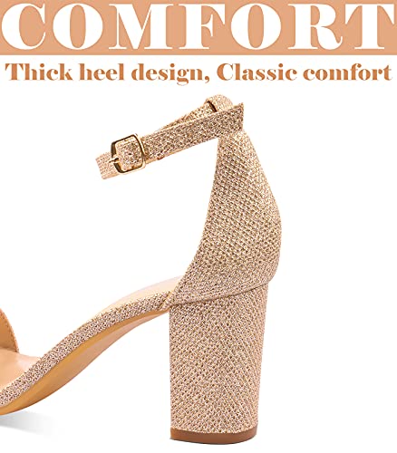 Ankis Gold Heels for Women – Open Toe Ankle Strap Chunky Heel Pump Sandals Party Wedding Strappy Buckle Sandals Standard Size 2.75 Inches Tall Thick Heel Design (Gold Glitter, numeric_11)