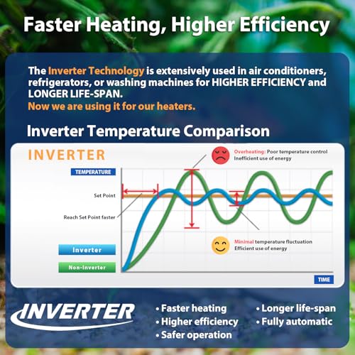 - ACCURATE TEMPERATURE – Thanks to the intelligent inverter technology, with the in-built chips the thermostat keeps the aquarium heater at a constant temperature at an accuracy of 1F, much more accurate than the traditional knob-controlled fish heaters. The thermostat shows 2 readings – the current temperature and the set temperature – very easy to operate.