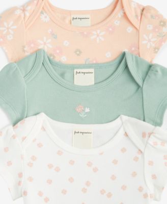 Sweet floral details bring garden-inspired style to the cotton bodysuits in this convenient three-pack from First Impressions.