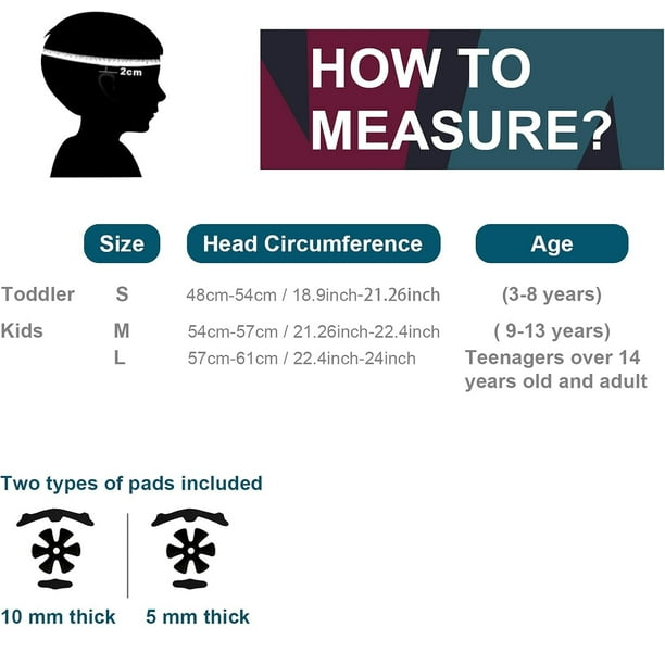 - SUITABLE SIZE: This kids helmets have 2 size for Age 3 and older. Suit for toddler/kids/youth/adult/teenager. Small size is 18.9” – 21.26”. Large size is 21.26′ – 22.4”. Measure the circumference slightly above eye brows to ensure you choose the correct size. NOTE:If you have any questions please contact us as soon as possible,we will try our best to solve your problem and give you a satisfactory reply.