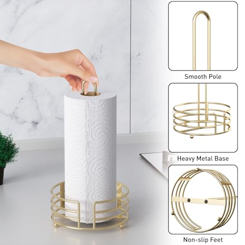 Buruis Shiny Gold Paper Towel Holder for Kitchen Countertop – One Hand Tear with 8″ Wide Base, 13″ Height, Raised Feet & U-Handle – Premium Steel Stand, Fits Jumbo Mega Rolls