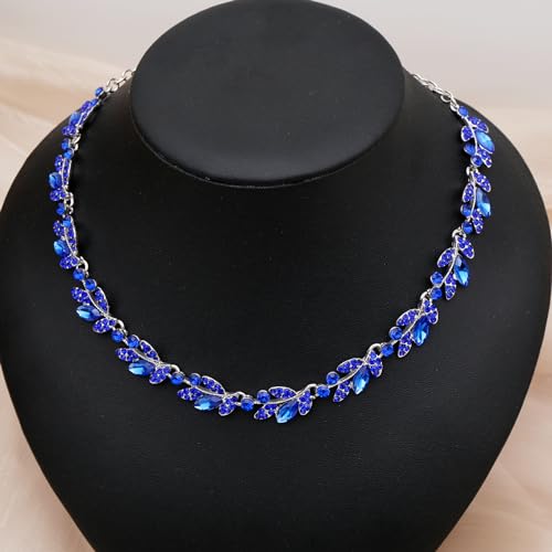 chaoyite Elegant Leaves Choker Necklace Dangle Earring Link Bracelet Crystal Jewelry Set for Brides Bridesmaid Prom Costume Accessories for Women (royal blue crystal-platinum tone)