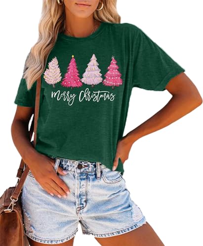 Christmas Tree Shirts for Women – Merry Xmas Graphic Tee Tops (Pink, Green, X-Large)