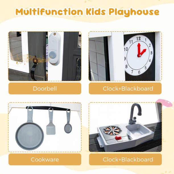 COCLUB Wooden Outdoor Playhouse for Kids Ages 4-8 – Spark imagination with this charming outdoor play house! Designed as a kids outdoor playhouse with a realistic cottage style, it features a working doorbell, flower pot holders, and a fully-equipped kitchen (includes pots, pans, and sink) – perfect for playhouses for kids ages 4-8. The outdoor house for kids also includes a pet-friendly door with curtains, allowing dogs or cats to join the fun, making it ideal for family bonding. Foster creativity and learning with two teaching clocks and role-play activities in this playhouse for kids outdoors, designed to boost cognitive skills and social interaction. Safety is prioritized with child-safe materials: splinter-free wood, shatterproof windows, and BPA-free plastic tools.This kids play house is easy to assemble with pre-cut panels and includes 24/7 support. Measuring 45”L x 43”W x 65”H, it’s the ultimate kids outdoor play equipment for backyard adventures.