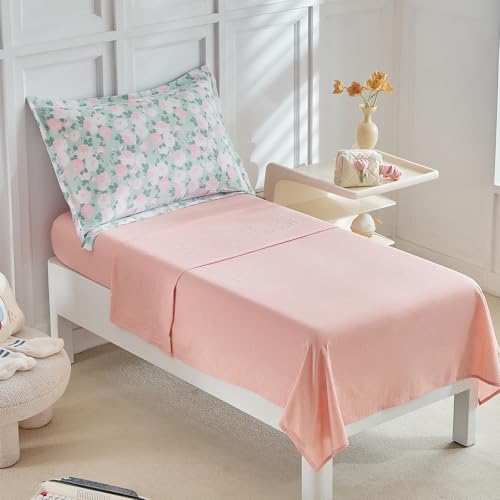 - Green Floral Bedding Set: The reversible toddler comforter is green and combines various pink flowers on both sides to attract children’s interest. The sheet set is a solid green, simple and cute. Together, they create a cozy atmosphere for your toddler’s room