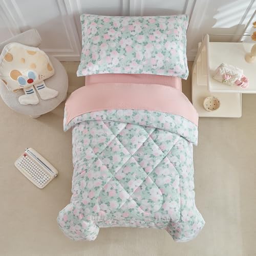 DuShow Toddler Girl Bedding Set,4 Pieces Floral Toddler Girl Comforter Set,Super Soft Reversible Kids Sheet Set,Lightweight Flower Crib Bed Set -Green