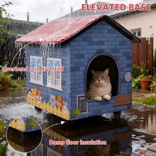 - 【Elevated Cat House】The slanted roof design prevents rainwater from pooling, while the elevated base and door curtains keep moisture out and prevent heat loss, keeping the interior warm and dry.