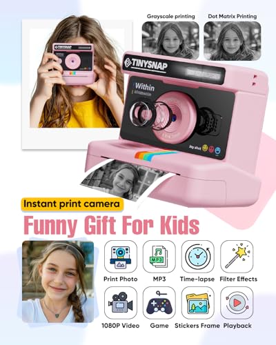 - Multifunction & Funny : This kids digital camera has the most popular instant printing, 2.4-inch large screen, 1080P video,16x digital zoom, flash, time-lapse photography, continuous shooting, games, mp3,photo frames, and filters. Print funny photos and doodle as you like to make life more interesting