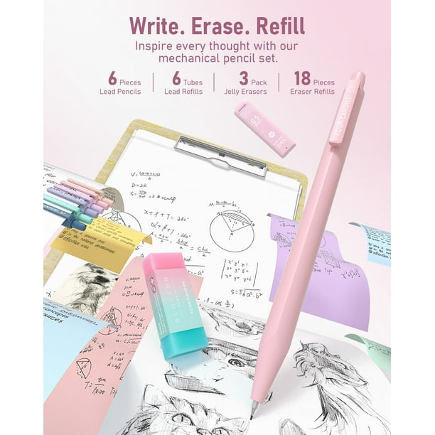 - All-in-One Bulk Pack: This pack includes 12 pastel colored highlighters, 6 adorable mechanical pencils, 5 black ink gel pens, 5 gel pen refills, a charming pink pencil pouch, 3 jelly erasers, 9 cap erasers, and 6 tubes of lead refills. It’s the ultimate collection of multifunctional stationery essentials for office supplies.