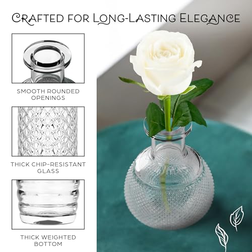 - ENJOY THE CLEAR elegance of your party vases. When light hits each small vintage-inspired bud vase, it sparkles brilliantly! These small vases for flowers are crafted with strong glass that stands up to bumps and knocks, ensuring they last for many celebrations