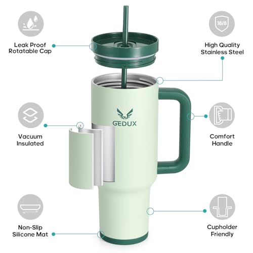 Specification: Gedux 40oz Tumbler With Handle, 2-IN-1 Leak Proof Lid (Straw/Flip), Insulated Water Bottle, Stainless Steel Tumbler with Non-Slip Silicone, Wide Mouth Travel Mug Cupholder Friendly Dishwasher Safe