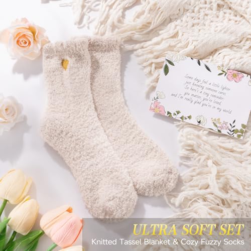 - 【Ultra-Soft Knitted Tassel Blanket & Cozy Fuzzy Socks】Wrap her in warmth with our luxury knitted blanket, crafted from premium polyester for unmatched softness and coziness. The stylish tassel trim adds a touch of elegance, while the plush, fluffy texture provides soothing comfort—perfect for relaxation, recovery, or self-care. Paired with cozy fuzzy socks, it’s an ideal after-surgery gift, cancer care package, or sympathy gift to surround her with love and support.