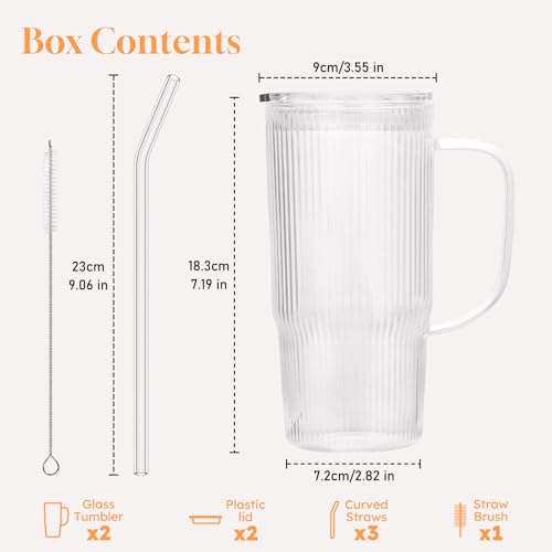 - RIBBED DESIGN WITH HANDLE — Designed with a timeless vertical stripe texture and an easy-grip handle, this glass tumbler with straw and lid adds both beauty and function — no more discomfort from hot or cold drinks