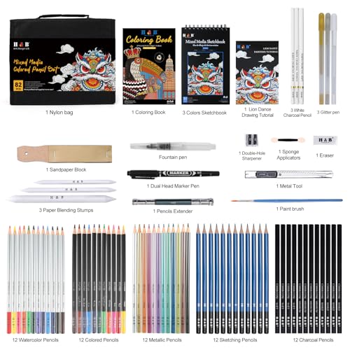 - [PROFESSIONAL COMPLETE DRAWING SUPPLIES SET] – H&B 82 Pack Art Shading Pencil Set includes : 12 water-soluble colored pencils and 12 metallic colored pencils, 12 graphite sketching pencils, 3 black charcoal pencils, 12 black stemmed stick-tip colored pencils, 2 drawing books and other accessories. Each pencil is labeled with a color name and model number so you can sketch as you see fit.
