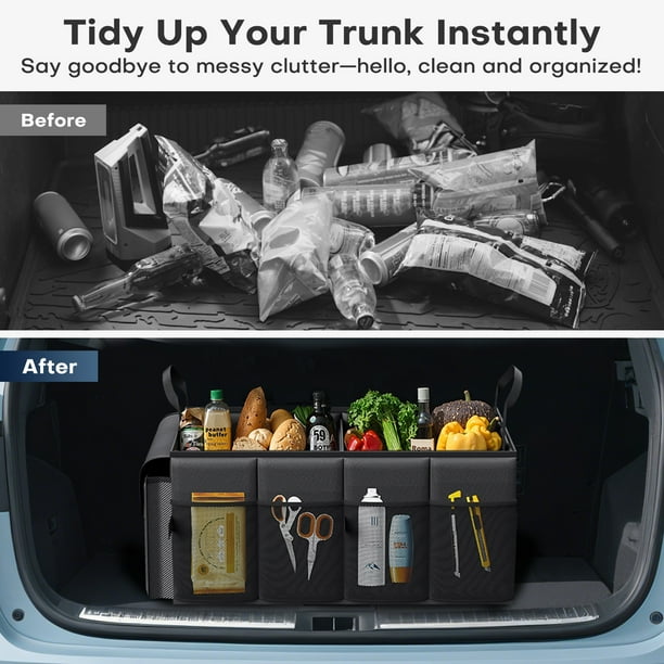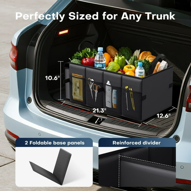 - SPACIOUS & ORGANIZED: This car trunk organizer for sedan includes 6 compartments to keep groceries, tools, and gear neatly arranged and fits all your car organizers and storage needs.