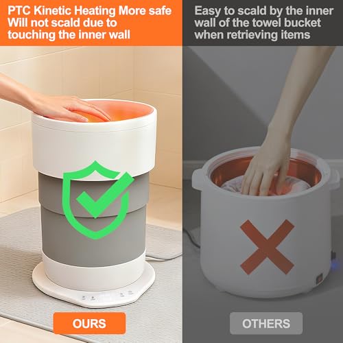 - 【Safety Performance】Safe and reliable (4-hour auto-shutdown feature enhances safety and saves energy). PTC kinetic heating technology ensures greater safety—touching the inner walls won’t cause burns. Compact design for easy storage. Lightweight towel warmer moves effortlessly around your home. Detachable bucket and lid allow for quick cleaning. Stylish circular base adds aesthetic appeal. Operates efficiently and quietly.