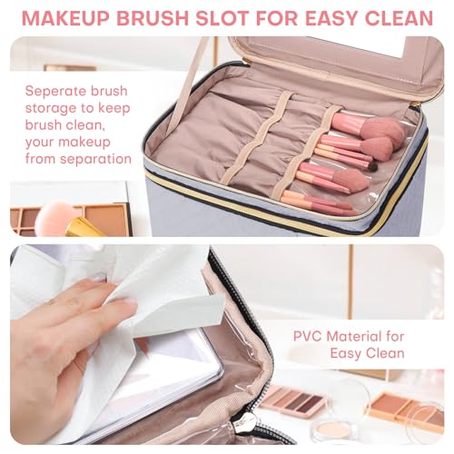HXLGMD Large Makeup Bag with Mirror Double Layer Travel Make Up Organizer Case, Large Capacity Coemetic with Brush Slot Divider, Travel Toiletry Bag for Women (Grey)