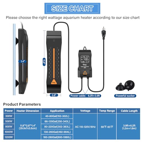Specification: hygger Aquarium Heater 300W 500W 800W 1000W 1200W, Large Adjustable Fish Tank Heater with Intelligent Automatic Power-Off System, Water Heater with LED Digital Display, for Saltwater and Freshwater