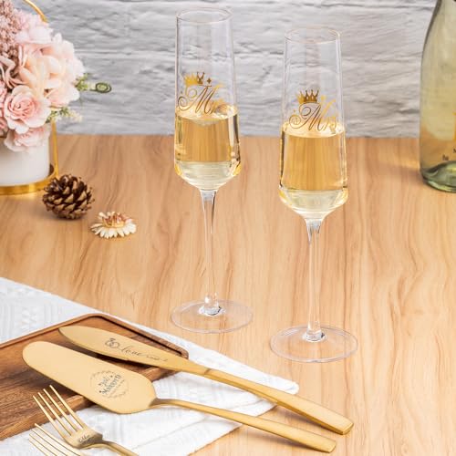 iooiluxry Gold Wedding Cake Knife and Server Set, Mr and Mrs Champagne Flutes Glasses with Cake Cutting Set for Wedding Bridal Shower Gifts