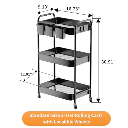 JAQ Makeup Carts, 3-Tier Metal Rolling Utility Storage Organizer Cart Shelf with Wheels for Craft Office Supplies Diapper Snack in Bathroom Kitchen Laundry Classroom Dorm -(3-Tier,Black