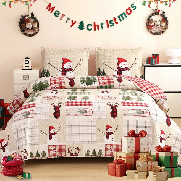 - Red Christmas Bedspread: The quilt set pattern consists of deer head , Christmas tree,and snowman pattern. Classic styles are deeply loved by kids and adults. It can be used as a gift for adults and children.