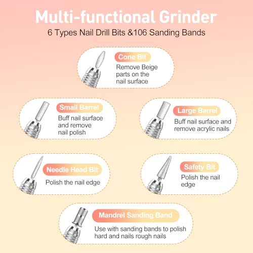 - Professional Nail Drill Kit: Electric nail file equipped with 6 nail drill bits and 100pcs sanding bands, meet all your demands for acrylic gel nails, dip powder nails and poly nail gels, works effective for polishing, shaping and removing