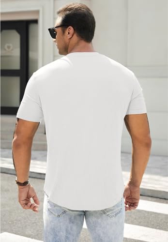 JMIERR Men’s Muscle Slim Fit Button Henley Shirts Summer Crewneck Short Sleeve Longline Fitted T-Shirt Gym Workout Athletic Tees Shirt for Men, M, White