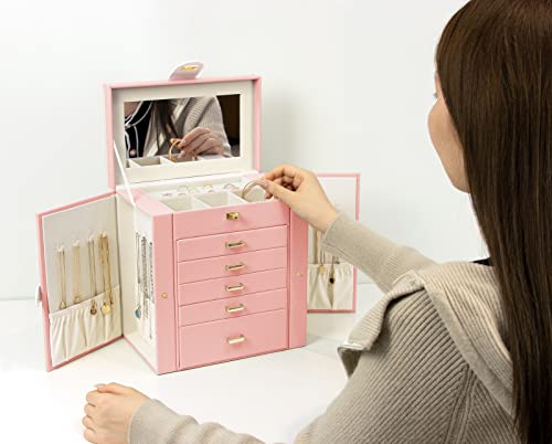 KAMIER Jewelry Box for Women, 6-Layer Large Jewelry Organizer Box with Mirror & 5 Drawers for Rings, Earrings, Necklaces, Bracelets,Pink