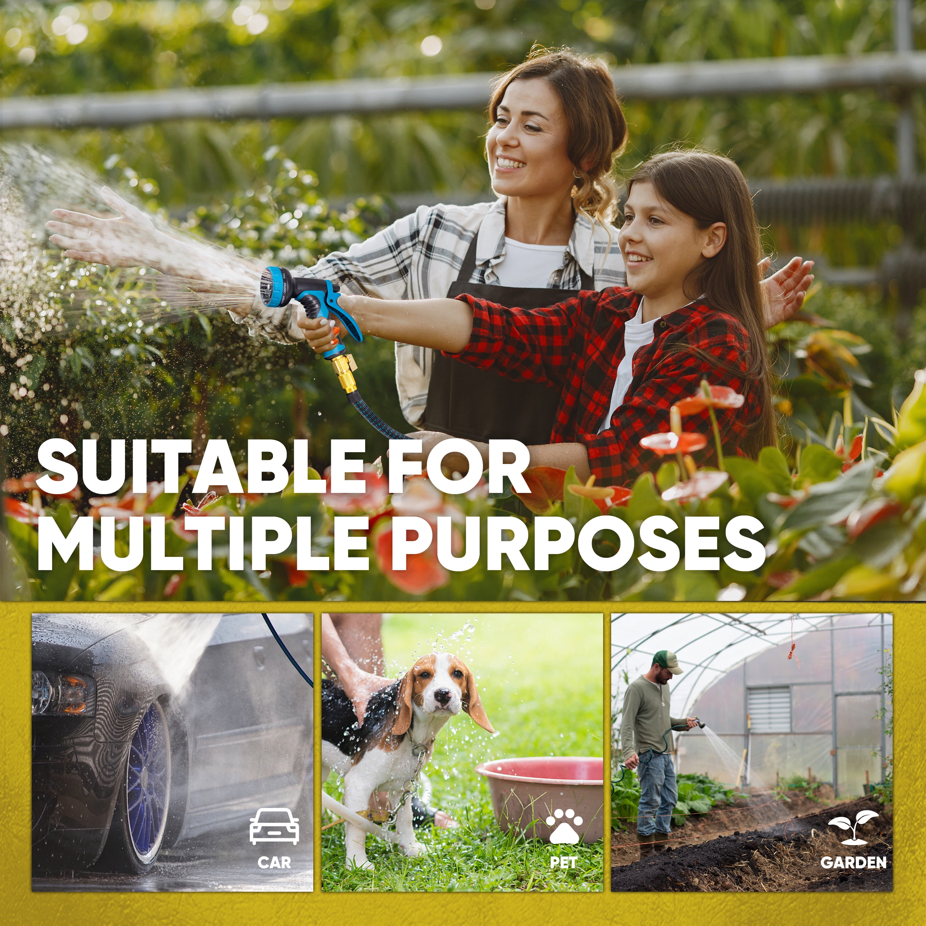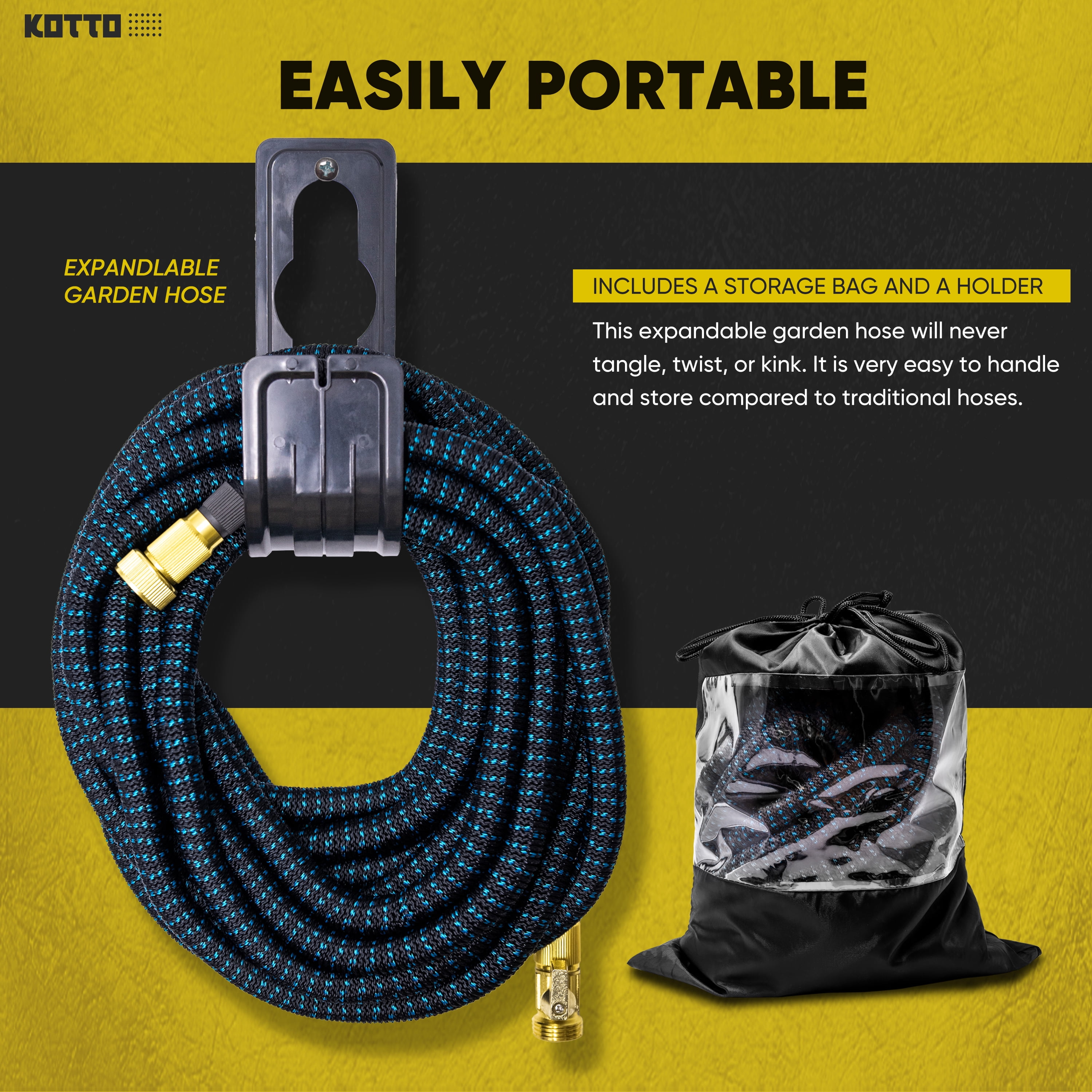 Kotto Expandable garden hose is designed for outdoor watering and cleaning tasks. This Expandable garden hose extends up to a water hose 50 ft under water pressure and retracts after use for compact storage. The lightweight design makes it easy to carry and store in the included travel bag. The Expandable garden hose is made with durable polyester fabric and a latex core to help prevent leaks and kinks. It works well for garden watering, yard cleaning, and as a car wash hose. The set includes a 10-pattern spray nozzle and three interchangeable nozzle heads for different water flow needs. This Expandable garden hose is a practical option among water hoses and water hoses for outside, offering flexible reach for everyday outdoor use. The package also includes a hose holder and portable storage bag.