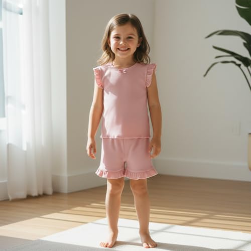 Kupretty Toddler Girl Clothes 1T 2T 3T 4T 5T Baby Summer Outfit Ribbed Knit Ruffle Sleeveless Shirts Ruffled Shorts Set (Pink, 18-24 Months)