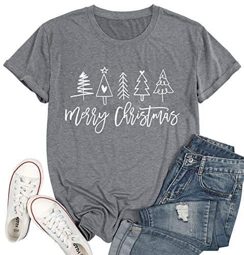 Merry Christmas Shirt for Women Christmas Tree Tees Tops Letter Xmas Tree Graphic Print Female T Shirt (Grey,Small)