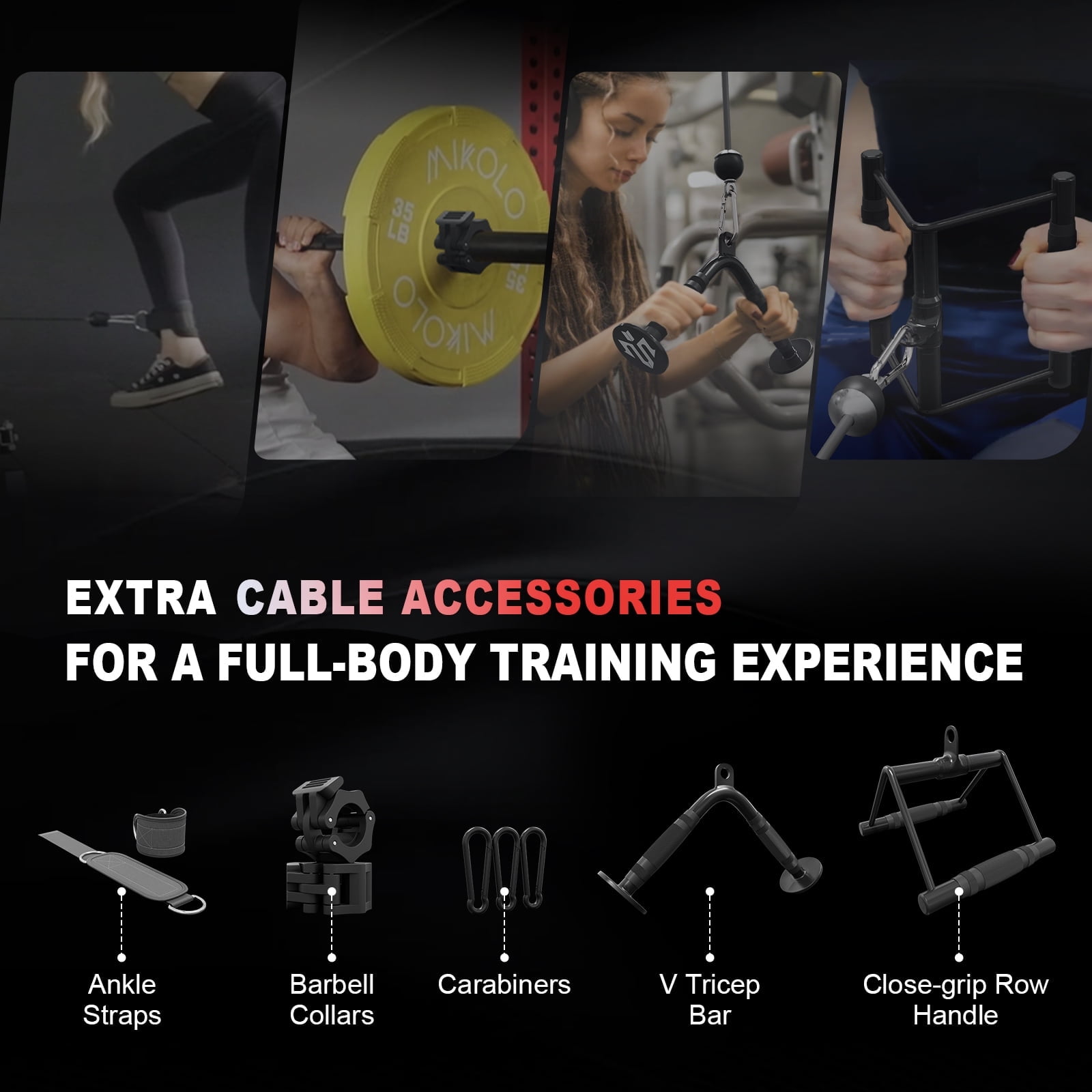Mikolo M4 multi-functional smith machine is combined with Power rack / Functional trainer / Lat pulldown station (includes leg holder) / 1:2 ratio Low row station (includes footplate attachment) / Smith machine / Chin station / Dip station / Core trainer / Landmine station / Suspension trainer. That means you could spend one machine money to get nine products with different functions. Our company’s mission is to bring an entire gym into your home with the least spending, and let you able to do unlimited exercises at limited space.