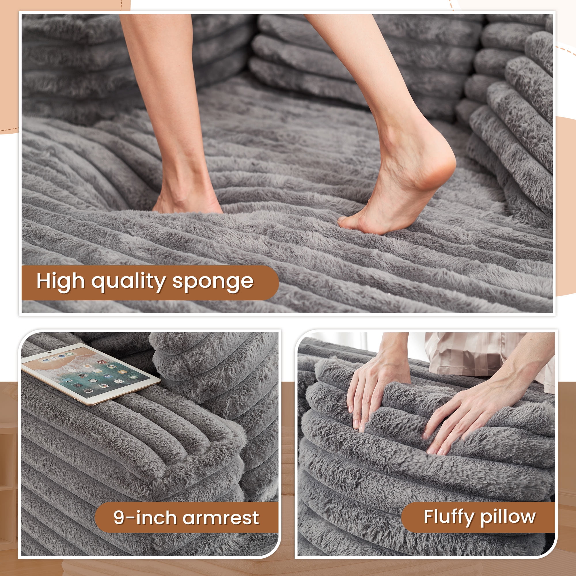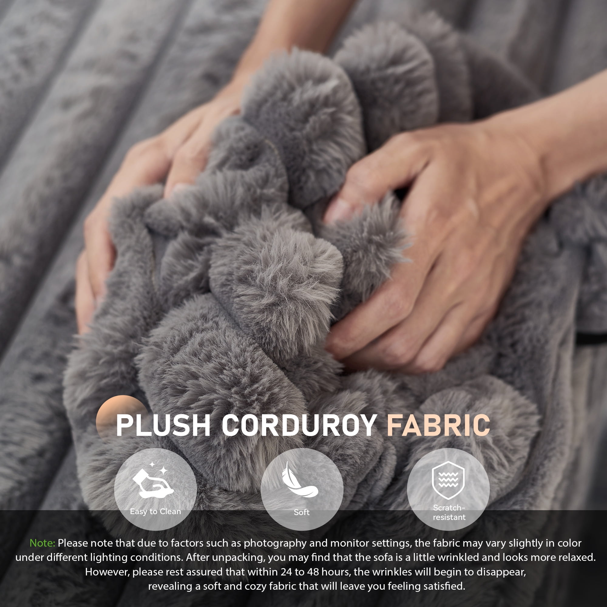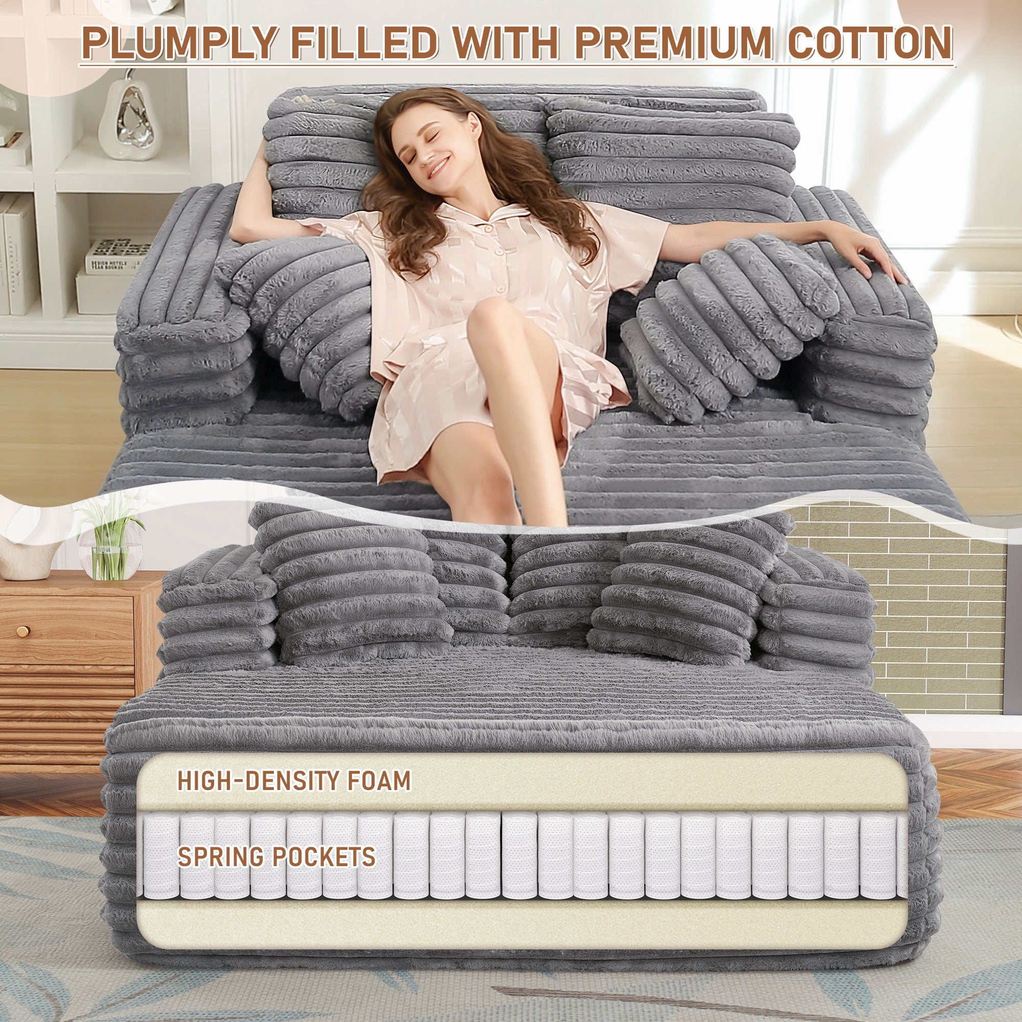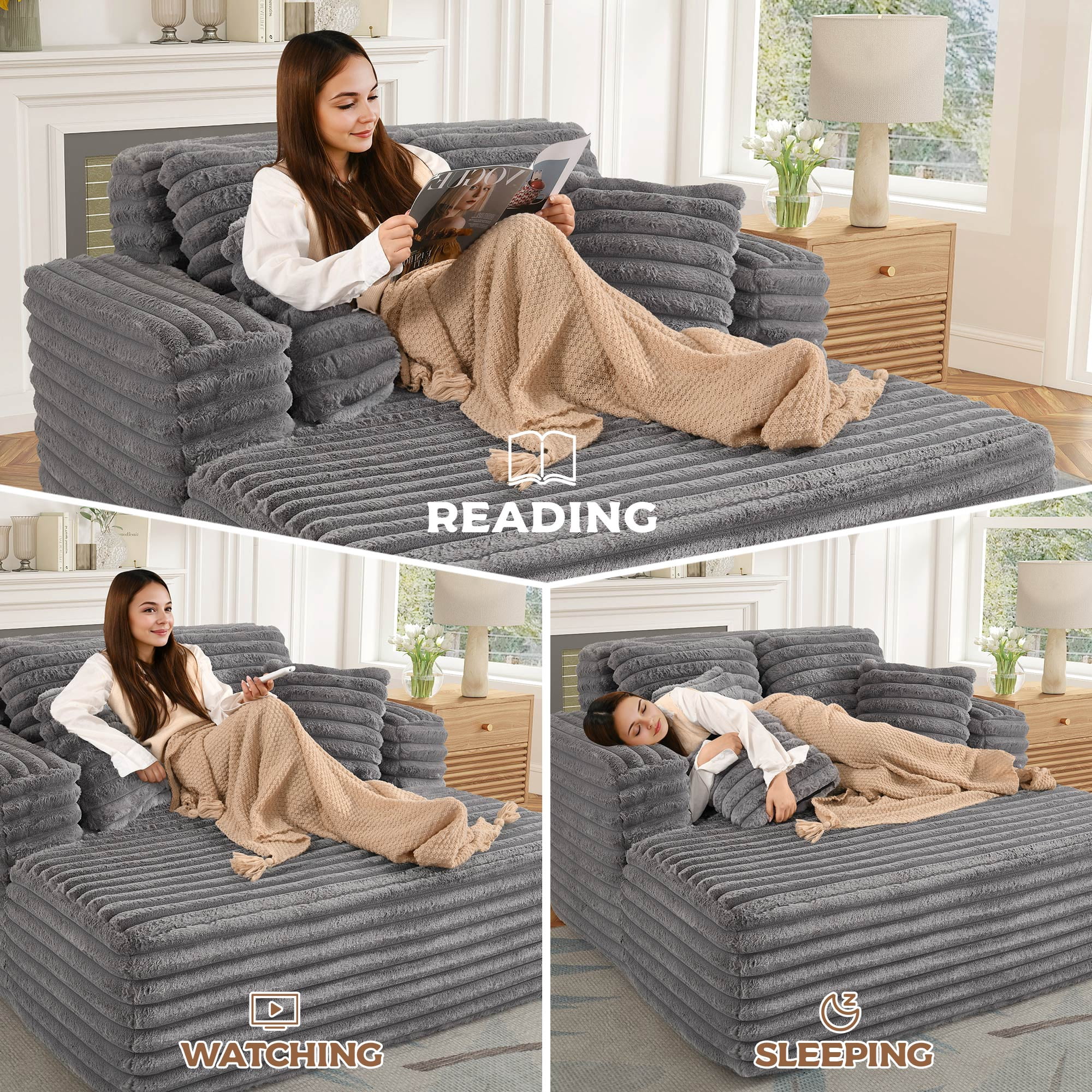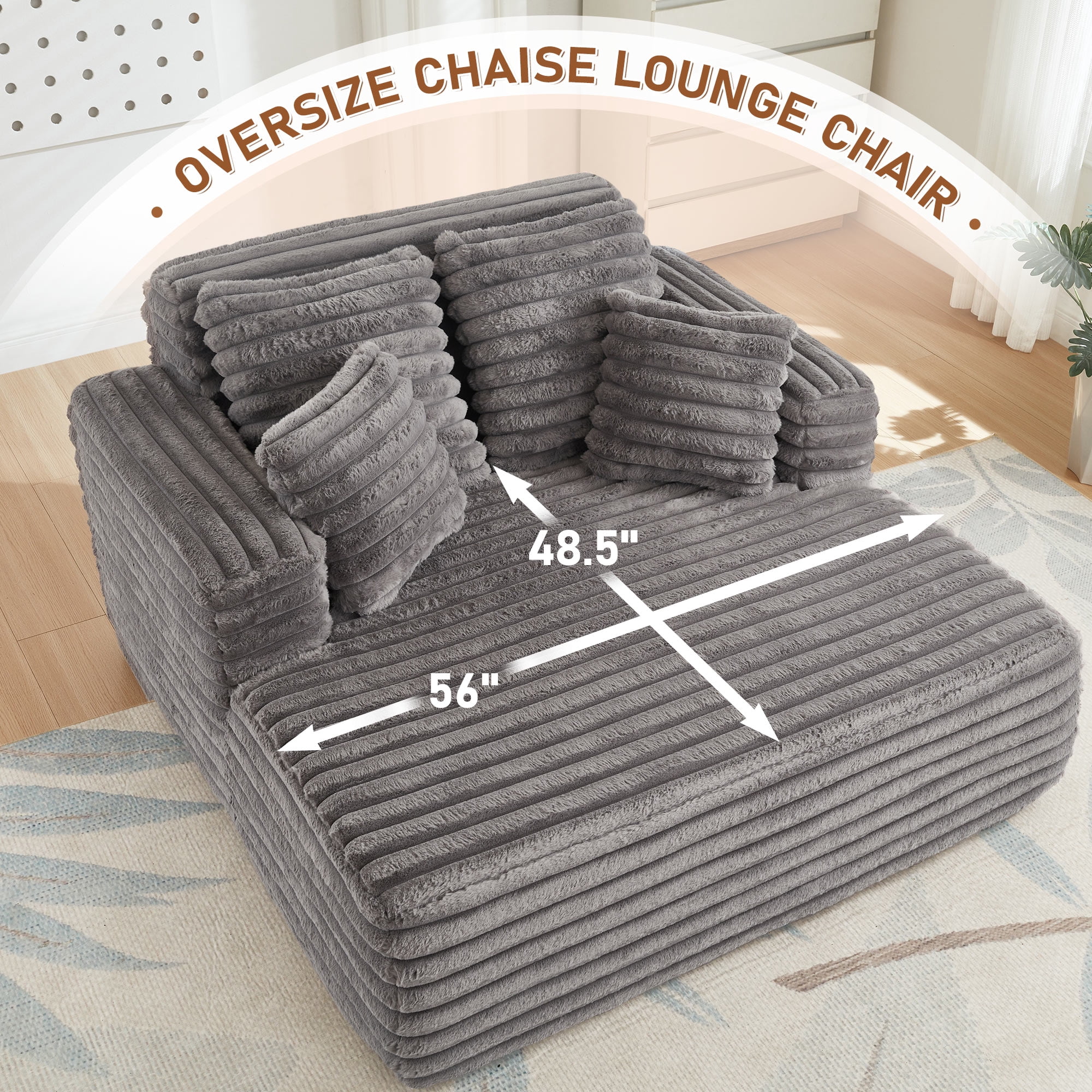 Muumblus Oversized Chaise Lounge Chair Indoor Furniture, No Assembly Required, Plush Corduroy Upholstered Sofa Bed Cozy Sleeper Couch for Living Room, Bedroom, Grey