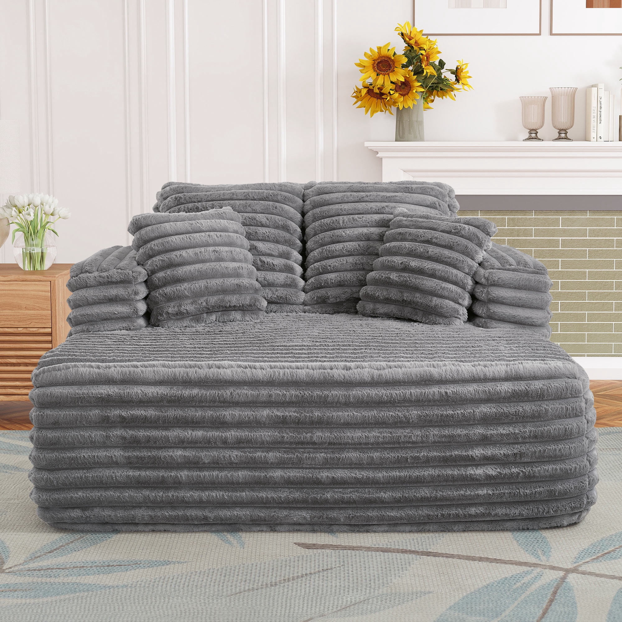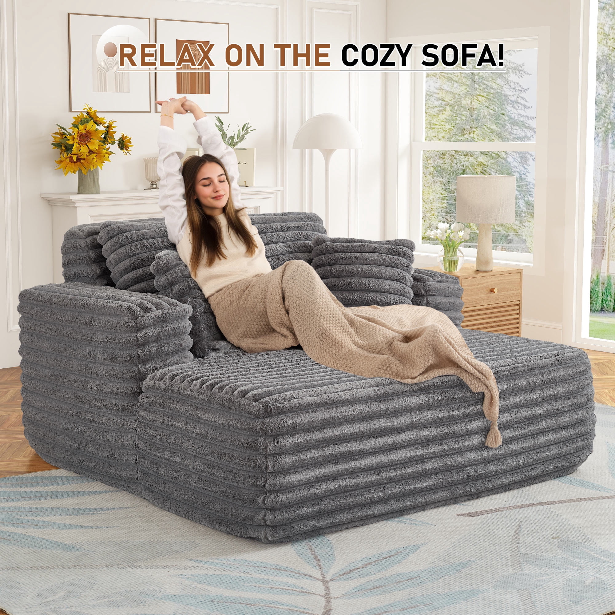 Upgrade your indoor relaxation with the Muumblus Oversized Chaise Lounge Chair, a plush chaise lounge indoor furniture piece designed for ultimate comfort and style. This lounge chair indoor features soft, cloud-plush corduroy upholstery and comes with four cozy pillows, making it a perfect addition to your living room, apartment, or office. The Muumblus oversize chaise lounge doubles as a sleeper sofa bed, offering a versatile solution for lounging or accommodating overnight guests. Its modern, mid-century inspired design with square arms and a supportive back cushion delivers both elegance and ergonomic support. The extra-large seat depth and width provide ample space for two adults, while the sturdy construction supports up to 500 lbs. No assembly is required—simply unbox, allow the vacuum-compressed cushions to expand for 48 to 72 hours, and enjoy instant comfort. Easy to maintain, this chaise lounge can be cleaned with a vacuum or a damp cloth for small stains. Elevate your home decor with the Muumblus sleeper chair, a cozy and inviting double lounge chair indoor that blends seamlessly with modern interiors.
