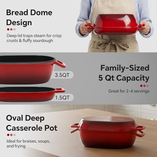 - 【Elegant 2-in-1 Enamel Design】: Christmas Gifts for Women / Men / Mom / Dad who is baker lover. A premium enamel-coated cast iron dutch oven featuring a deep lid and shallow base. Use together as a 5 Qt Dutch oven or separately for sourdough bread baking, slow-cooked meals, and everyday cooking / baking.