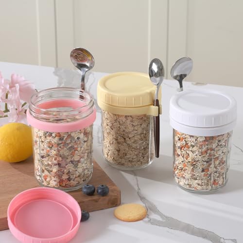 novelinks 6 Pack Overnight Oats Containers with Lids and Spoons,16 Oz Mason Jars, Leak Proof Overnight Oats Jars, Oatmeal Cups,Meal Prep Containers (3 Colors Lid)