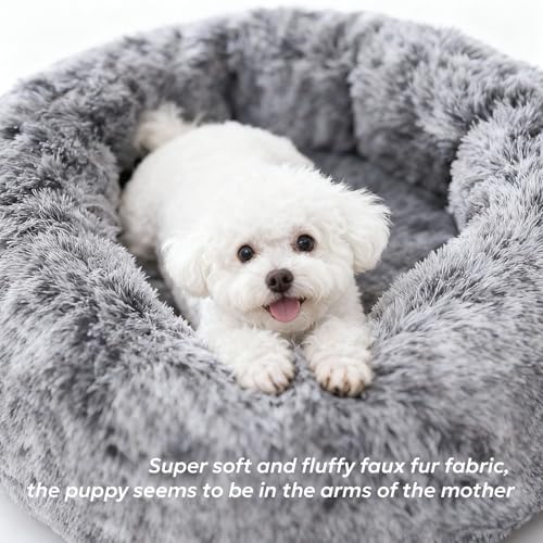 OlaPhum Small Pet Bed for Puppy Cat & Rabbit – Calming Donut Dog Bed Washable and Non-Slip, Anti-Anxiety Fluffy Plush Faux Fur Comfort Pet Beds for Indoor Kittens (Dark Grey, 20″)