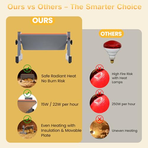 - ⚡ ENERGY-EFFICIENT 35W — save up to 85% vs heat lamps Traditional red bulbs use 150–250W, generate dangerous hot spots, and spike electric bills. Our radiant brooder plate uses only 35 watts, providing warmth at a fraction of the cost while dramatically lowering fire risk. Perfect for long brooding cycles, winter use, and homesteaders wanting reliable warmth that won’t drain power.