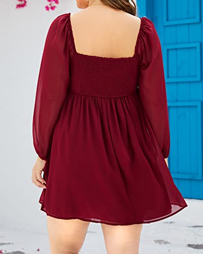 Pinup Fashion Square Neck Dress for Women Plus Size Burgundy Puffy Long Sleeve Cocktail Short Homecoming Summer Red A-Line Flowy Dress
