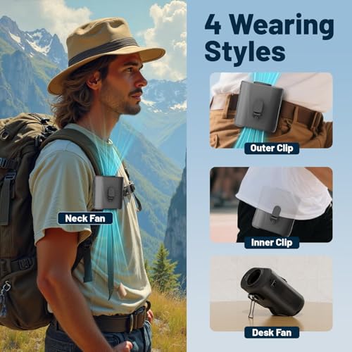 - 5-in-1 All-Purpose Wearable fan:More than a belt fan, it also functions as a neck fan, handheld fan, desktop fan, and emergency power bank. Whether you’re at job sites, hiking, gardening, or making deliveries, this multi-functional fan keeps you cool, hands-free, and comfortable.