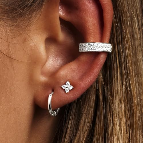- [Ideal Size] The silver hoop earrings and dimaond huggies both have an 8mm inner diameter, while the flower stud measure 4mm. These beautifully crafted small silver hoops are a chic accessory that complements any outfit and are perfect for trendy cartilage or helix piercings