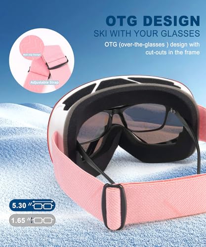 QALLY Anti Fog Ski Goggles for Men Women Snow Goggles with UV Protection Snowboard Goggles, White Frame Silver Lens/White Frame Pink Lens