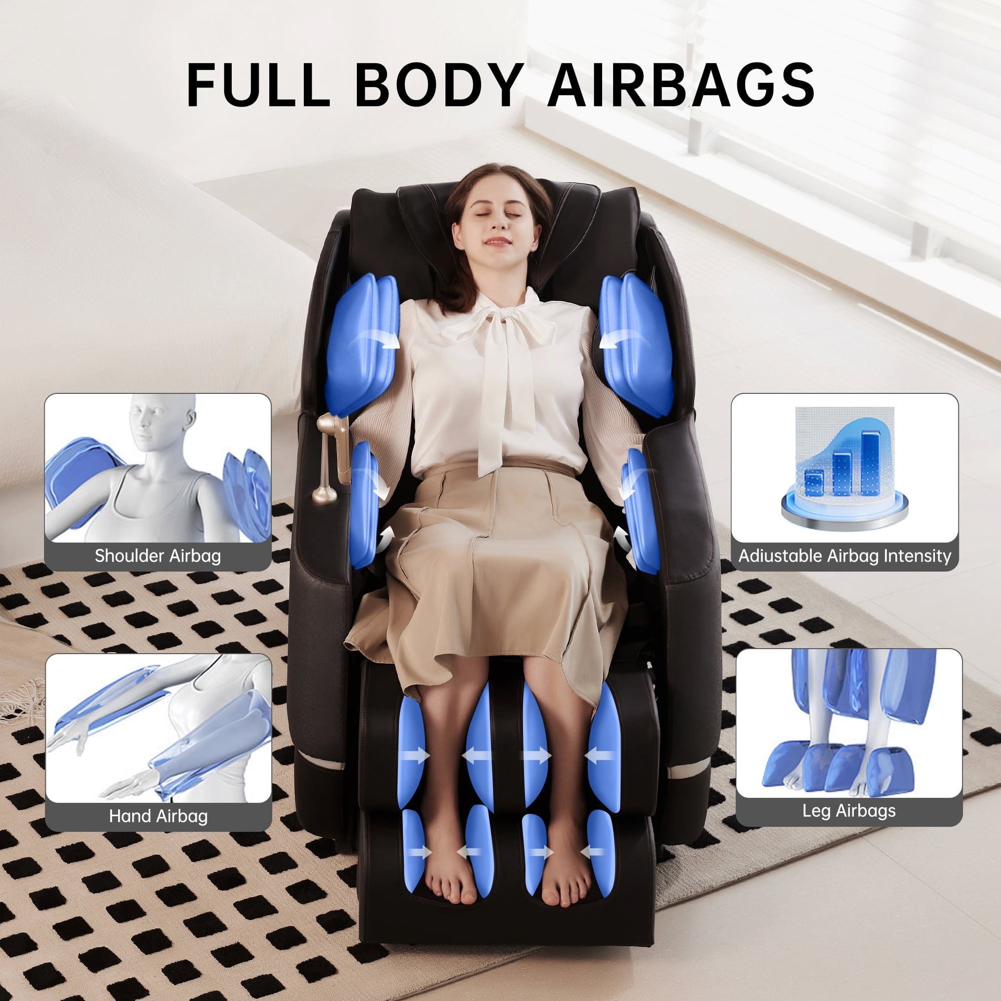 5 preset auto programs, diverse massage choices. Build in 8 massage back rollers, foot rollers massage, airbags placed over the shoulders, arms, hips, legs, calves, and feet, full body pain and tense relief. Shipped in one box, Easy to assemble.