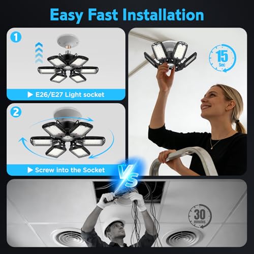 - 【Easy Installation】 Our shop lighting, garage lighting can supper fit for the E26/E27 socket, the garage led light is as simple as installing it in a ordinary a light bulb. You only needs 30 seconds for done. no need of any tools, wiring, or professional electrician. They are good led lights for shop.